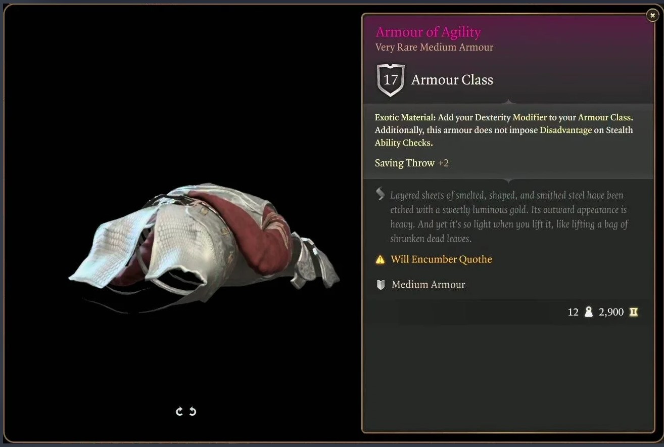 Bg3 Armor Of Agility. The Armour of Agility is a piece of armor you can equip on Baldur's Gate 3 (BG3) It has a +1 weapon enhancement bonus and provides Advantage on attacks against Monstrosity enemies like Owlbears and Worgs.